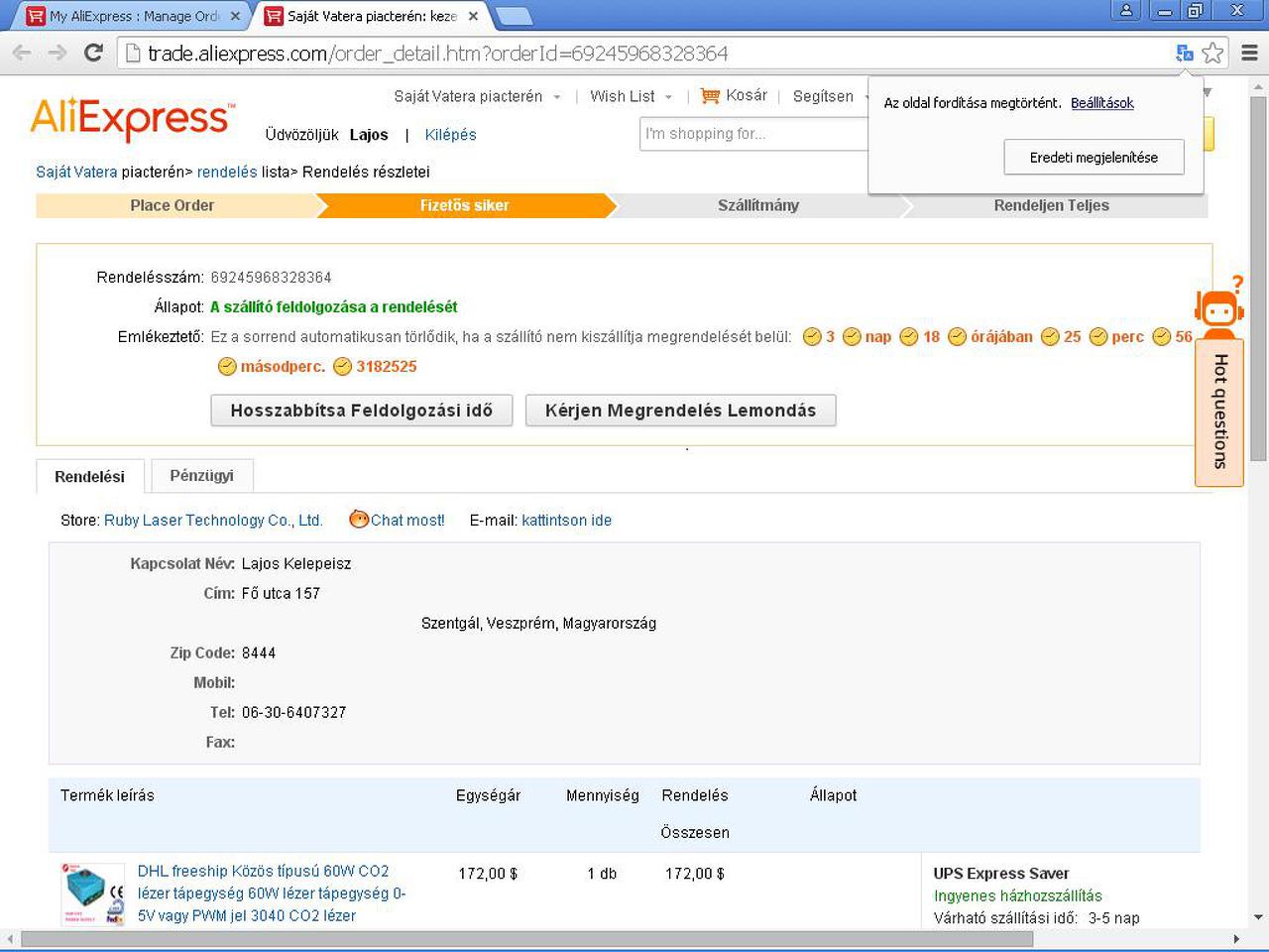 Dear friend, Sorry again for the inconvenience. Could you please confirm whether your paypal email is still the one you used to pay for us? I will refund you immediately right after your confirmation. Azt mondja hogy adjam meg neki a paypal email címemet?
