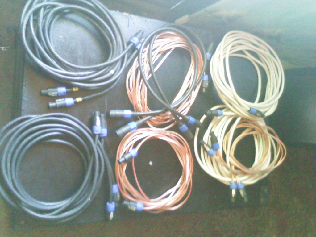 Kabelokrol van szo,akkor irok enis... a kep egy kicsit rossz minosegu... 2x10meter feher 3x2,5 vastag, 2x10meter atlatszo szilikonos 2,5vastag, 4x5m 3x2,5vastag, 2darab speakon toldo kabel a 4x5m hez... 2x2meter 6mm a subokhoz 4ohm ra.... meg mag par speakon atalakito rovid kabel az erositokhoz...