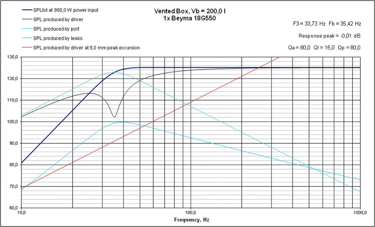 Ha azt túllépi, akkor elkezd szólni hangosan a cső. Süvíteni, zizegni fog a kiáramló levegő, ahogy elhagyja a cső peremét. A hangolási frekvencia a doboz méretétől és a csövek méreteitől függ, ezekkel az adatokkal, amiket megadtam, 38Hz -re lesz kihangolva a rendszer. Mint írtam, a Unibox 200L térfogatot ajánl hozzá, ennek utána kellene járni, hogy ez még jó -e a hangszórónak? Mert ha igen, akkor azon ütősebb hangja lesz és lemegy majdnem 35Hz -re az alsó határfrekvencia. A T-S paraméterek alapján egy szakember megmondja, én annyira nem ismerem a hangszórók lelkivilágát. A 150L és a 38Hz a gyári adatlapon van, abban biztos lehetsz, hogy az valós, a 200L pedig a Unibox által számolt méret. Csatolok két diagramot, az egyik 150L -es dobozzal, a gyári ajánlás szerint 38Hz -re hangolva, a másik 200L -es dobozzal, automatikus hangolással, amire 35,4Hz jön ki. Mindkettő a Unibox -ban lett modellezve. Idézet: Dehogynem, sőt, ekkora teljesítménynél mindenképpen merevíteni kell az oldallapokat, pl. ráragasztott/csavarozott merevítő bordákkal, meg lehet, hogy a szemben lévő lapok közé egymáshoz is kellene áthidaló merevítő a dobozba. Azért 900W már igencsak megzörgeti azt a dobozt. Nekem a 150W -os láda oldallapjai hajlongnak, mikor ki van hajtva, kézzel rátéve érezhető. Pedig az csak egy 40x40x40cm -es kocka doboz, 22-es MDF -ből. „Valamivel nem kell még lazán ki töltenem a dobozt, ha kész lesz ?” A hozzászólás módosítva: Júl 20, 2015