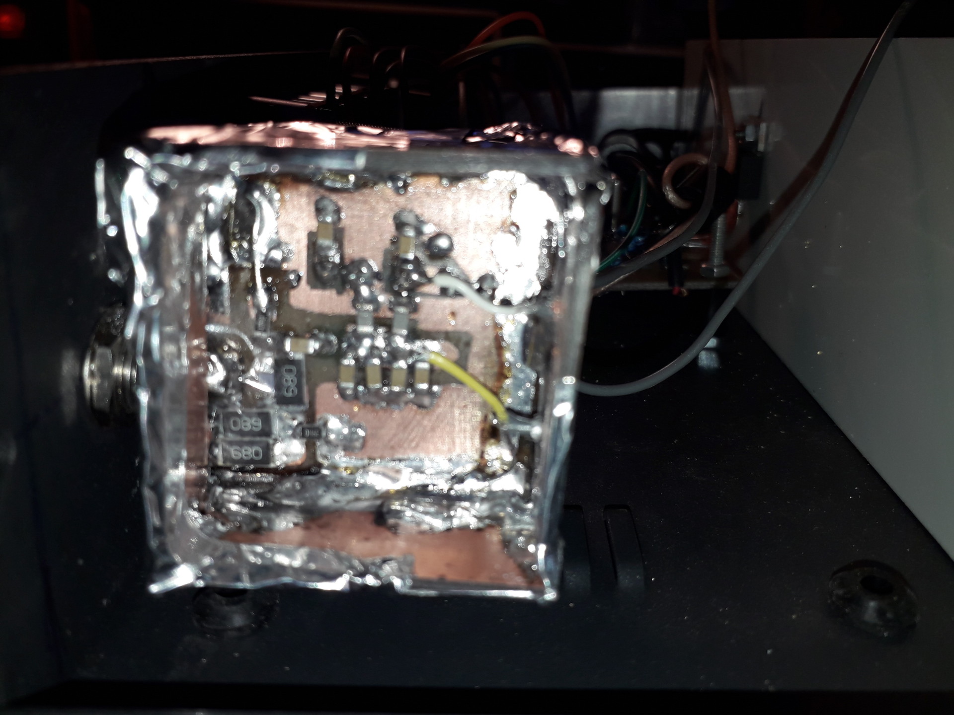 Nálam egy pici kétoldalas paneldarabra épül fel, ami vékony rézlemezzel van keretezve meg fedve, ezen egy talpas SMA ajzat forrasztva. A panel két helynen van átfúrva, ott egy vastagabb átvezető drót van, de mindkét oldalán smd kondikkal, hidegítve. Nincs benne szűrő tekercs, mert a jelen doboza nem tekinthető mágnesesen árnyékoltnak, ezért kihagytam.