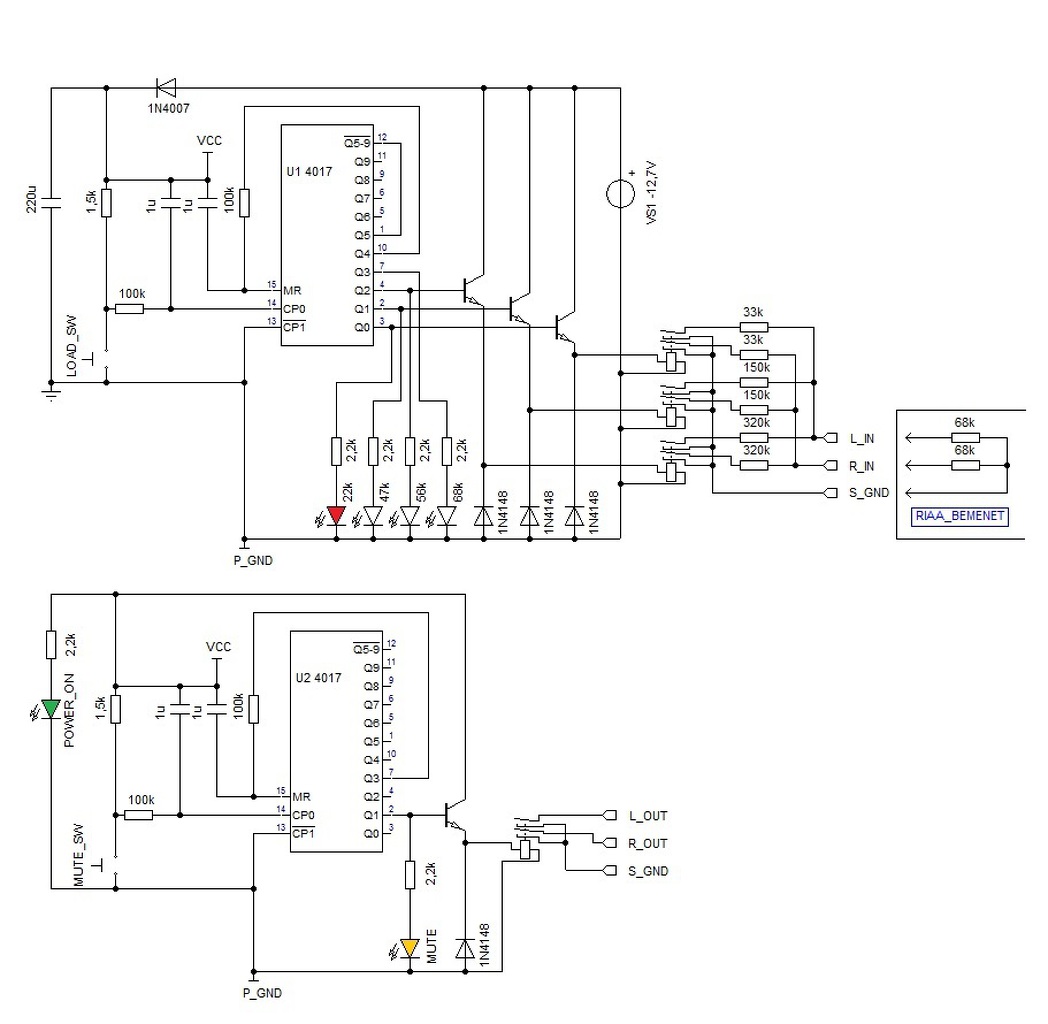 Proli007 segítségével (bár kétlem hogy tudná, ismét mennyit segített, ezúton is köszönöm!) csináltam 1 nyomógombos panelt a PH5 korrektorba. Funkciói: Bemenőimpedancia-választás: 22k, 47k, 56k, 68k. MUTE funkció, és be-ki kapcsoló nyomógomb. Az egész dolog CD4017-es számlálókra épül. Tervbe volt még egy Stereo/mono átkapcsoló szintén ugyanebben a felépítésben, de nem sok értelmét láttam.