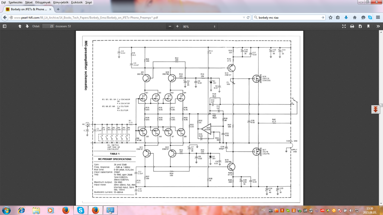 ![]() Sajnos én még egyáltalán nem hallottam ilyen hangszedőt szólni, ezért gyakorlati tapasztalatom ezekben nincs. Egyenlőre számomra ez még nem a megfizethető kategória, most még elvagyok az Ortofonnal. Ami rajzot beszúrtál, az is RIAA. Hasonlót építettem de az teljesen tranzisztoros volt, de ugyan így áramtükör meg FET volt az eleje. ITT VAN Ha megszerzed az eredeti rajzát az erősítőnek (REVOX B-250), találsz benne egy elég komoly MC előerősítőt is. Sajnos nem tudom milyen lehet, de magát az erősítőt sokan dicsérik, a RIAA korrektort pedig nagyon sokáig használtam, és szerintem egészen jó hangú kis áramkör, bár utána már azt mondtam, hogy a Pioneer kolléga által módosított HFM-1 élettel telibb hangképet nyújt.