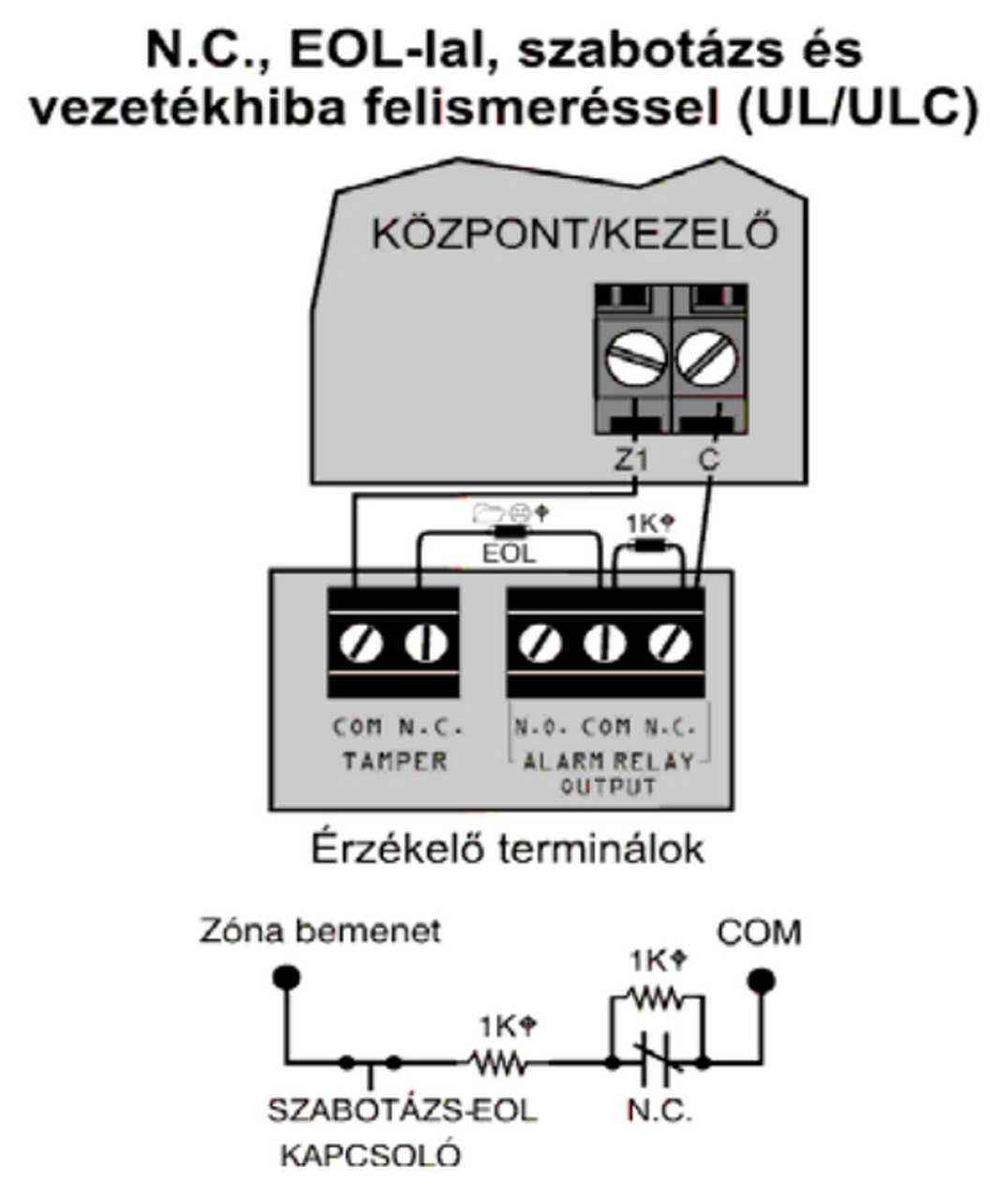 A kezelőhöz 1k kell, ha a zónabemenetét használod. Duplázhatsz zónát (én nem szeretem használni), ekkor be kell kapcsolni az ATZ-t és javasolt soros kötést használni. A kép, amit csatoltál soros DEOL. Annyival egészíteném ki, hogy az egy kilós tamper ellenállást két-két darab 1 kilós párhuzamos ellenállásból alakítanám ki. Így meglesz a tamper soros 1 kilója. A doboz tampernek van helye általában a fém központdobozokban, ahol át kell dugni (a talpa a doboz hátulja és a fal közé esik). Így jelzi ha leszakítják a központot és persze a nyitást is. Azt 1 soros ellenállással szoktam kötni, mert nyitott tamper zóna nem üzemszerű, karbantartáskor pedig egyszerűen kiiktatható. Ha a Z1 és a COM közé kötsz, akkor a kilóval zárt érzékelőd lesz az egyes, a 2,2 kilóval zárt pedig a kilences zóna.