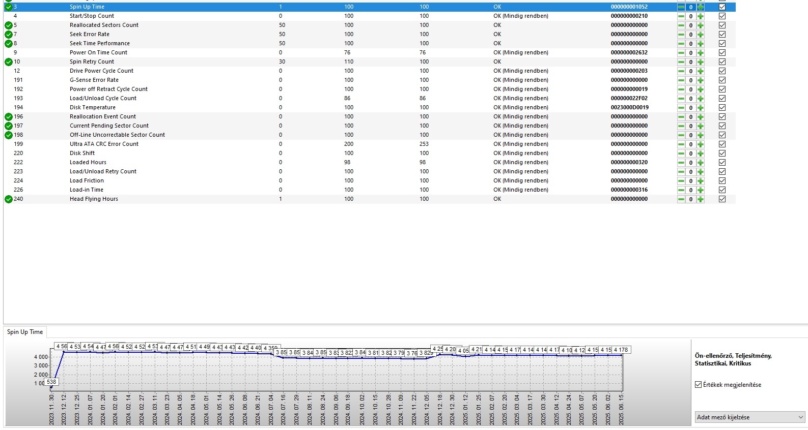 A 3-as attrib. 4134 ms-os (hex 0x1026) felpörgési idő is túl gyors, szerintem az az adat sem valós. 793 működési óra 525 elindítással, 142244 fejparkolással - ezek lehetségesek.