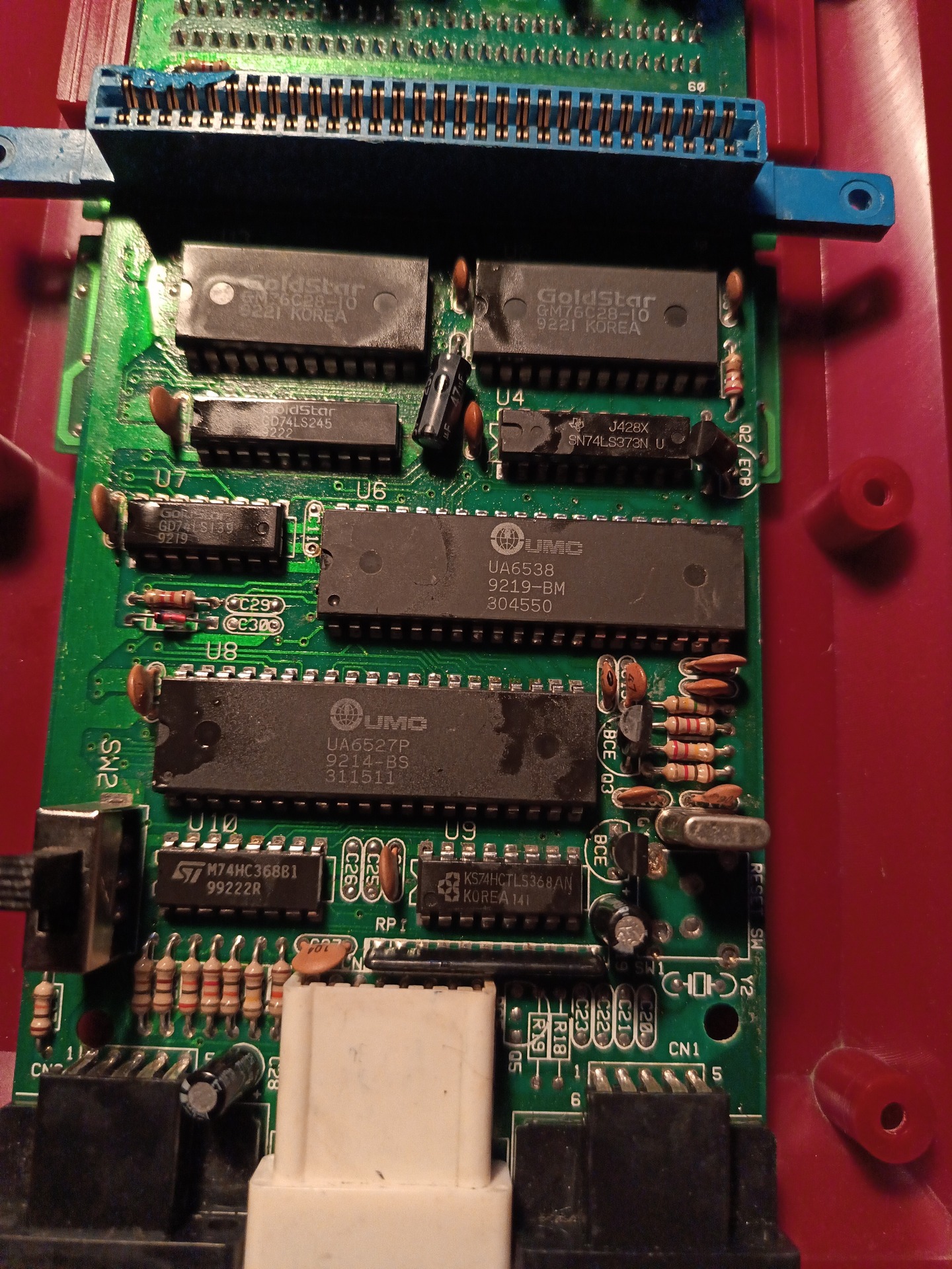Szereztem még egy Famicont a gyűjteménybe. Sőt olyan, mint szikorapéter fórumtársunknak van, csak érdekességnek raktam fel. A RAM-ok nem teljesen ugyanolyan típusúak, de különben ugyanaz a gép. Nincs jó állapotban. Reset gomb hiányzik, az RF modulátorát nagyon szétbarmolta valaki. Úgy adták nem ad képet a TV-nek.