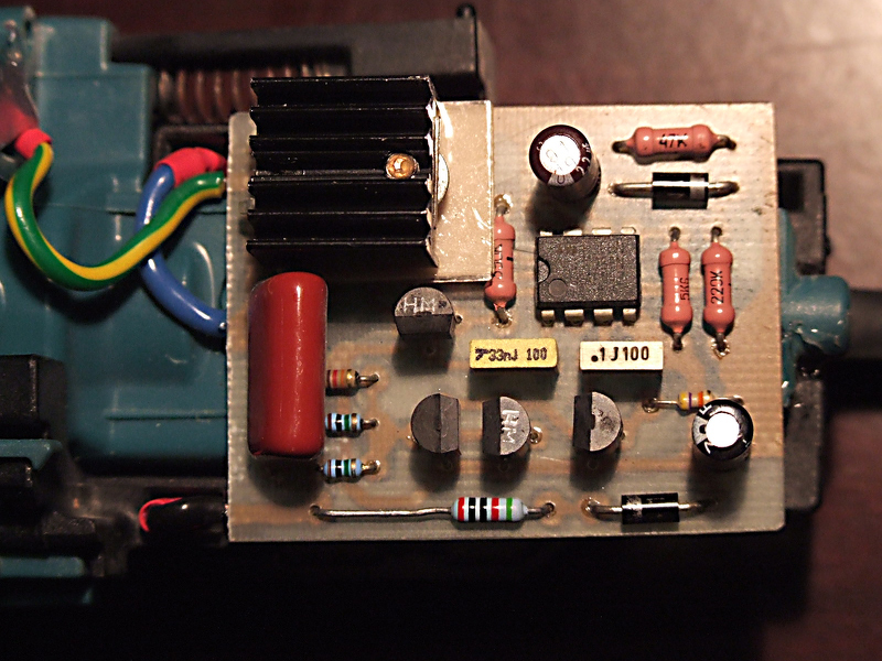 Én is megépítettem ezt a kapcsolást, és nagyon tutin működik, bár ezközöltem némi változtatást, mert akadozott. Nagyobb táp-koni kellett, és a feszültsége is határon volt, úgyhogy érdemes nagyobbat választani. A többi érték csak arért változott, mert nem vol itthon más, de igy is tuti. Köszönet azoknak akik feltették! ![]() Két flexbe is beépítettem, az egyik egy kis Makita GA5040-es 1100W-os, a másik egy 2000W-os 230-as Black&Decker, a típusát már nem tudom megmondani mert lekopott, de öreg kiszolgált darab, megérdemelte. A nagy flexbe macerás volt beépíteni de végül sikerült, övé lett a másik-panel, ám erről sajnos nincs kép. Rakok néhány képet ha valakit érdekel. Sok sikert mindenkinek.
