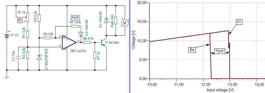 Én egy kicsit bonyolultabbá tenném a kapcsolást azzal, hogy ha a feszültség 12, 6 V fölé emelkedik, akkor automatikusan kapcsoljon vissza. törekedni kellene a kikapcsolt állapotbani minimális áramfogyasztásra, ez megvalósítható, ha a referencia, és a mérő feszültséget előállító áramkör fogyasztása alacsony, max 1-2 mA, vagy kevesebb. Végül is magát a kapcsolást elvégezheted elektronikus kapcsolókkal is, tranzisztorral, és FET -el is, ahogy pl. jobb autós hűtőtáskákban, vagy inverterekben is szokás.