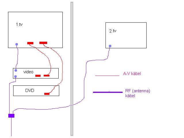 A mellékelt képen látható elrendezést kéne átalakítani, hogy a 2.Tv-n is lehessen a videot, DVDt nézni. Probléma 1 a 2.Tvn rossz a scart (proci letiltotta) 2 a video RF kimenete "gyenge" a jó képhez, és a védett DVDk jelét "nem engedi át"