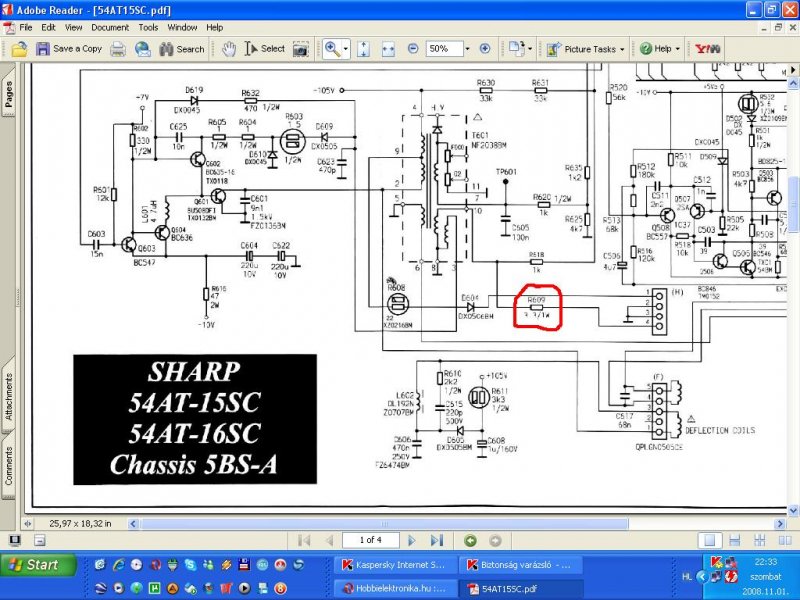 A problémám a Következő: Van egy Sharp 54AT-15SC típúsú tv-m. Eggyik este, amikor kikapcsoltam még nem volt semmi baja, de, amikor másnap be kapcsoltam a hang bejött (az jól is szól), de a kép nem jött be. Tudna a valaki segíteni,hogy mi lehet a baja? Képcsöves lehet? A képcső végén az izzitó nem világít. Régóta csinált olyant,hogy a kép egy pillanatra megurott és a hang reccsent eggyet. Válaszotokat előre is köszönöm. Mellékeltem a kapcs.rajzot.