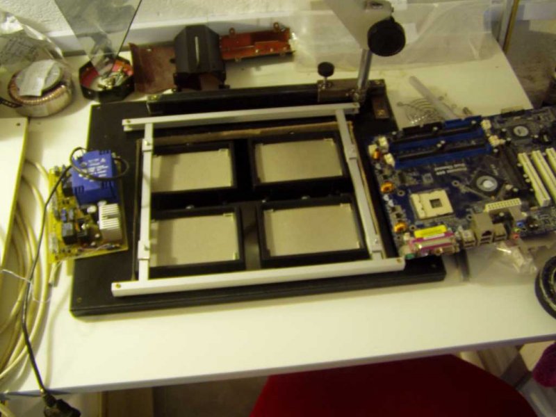 A BGA forrasztó állomásom jelenlegi státusza. Sajnos kb. fél éve alig haladtam vele, idő hiányában. Pedig egyre többször kellene. Talán az ősszel sikerül befejezni. A mechanikai rész nagy része már meg van. A felső lámpát kellene összeállítani, meg a vezérlését. A tápja, meg a dimmerje már meg van. Mikrokontroller illesztéssel rendelkezik, Tudja ki-be kapcsolni, kissebb, nagyobb teljesítményre állítani mind az előmelegítőt, mind a felső lámpát.