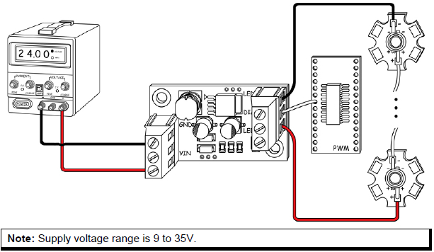 --------------- Pin ->Description: VIN ->Positive terminal for 9V-35V DC Power supply GND ->Power Ground LED+ ->Connect to the anode of LED LED- ->Connect to the cathode of LED EN ->PWM terminal. When applied with +5v or suspended, full amount of current will be output and when connected with ground, output current will be 0. Részletes adatlap az IC-ről itt