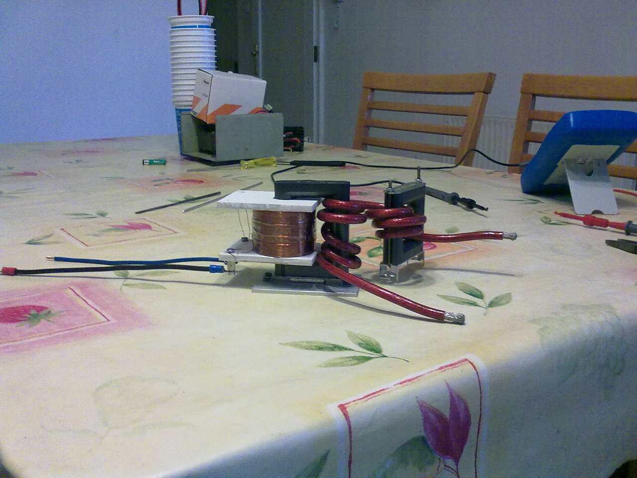 Tudom 24V-ot adnak meg, de 12V-ról akarom hajtani, mert primer tekercs a flybacken 5uH vagyis 4+4 menet másik flybackre tekerve. A gond az hogy sikerült 2812 menetet tekernem a szekunderre, ez kicsit sok szerintem, de féltem attól ha csak 1500 menetet teszek fel akkor nem érem el a 3 KV-ot, még 24V mellett sem. Persze 36V-ról vagy többről nem szívesen járatnám. Tudom meg kellett volna tervezni, de elmaradt. Úgy képzelem el, hogy 12V-os kocsi akksi utána Inverter (ez tud PWM-et+Frekit állítani, tehát 0-230V-ig) így be tudom állítani 24V-ra ha kell. Utána jön maga a meghajtó áramkör+ a Trafó, amit képen először küldtem (fenti fényképeim 2db). Mindez azért jó szerintem, mert be kell állítanom a 3KV-ot 35Khz-re. Egyébként ez Neon Sign Transzformátor lenne. Ezt használják Tesla tekercs indító nagyfeszének, általában. A word dokumentumba leírtam minden adatot, a tekercsek(primer+Secunder induktivitásait is).
