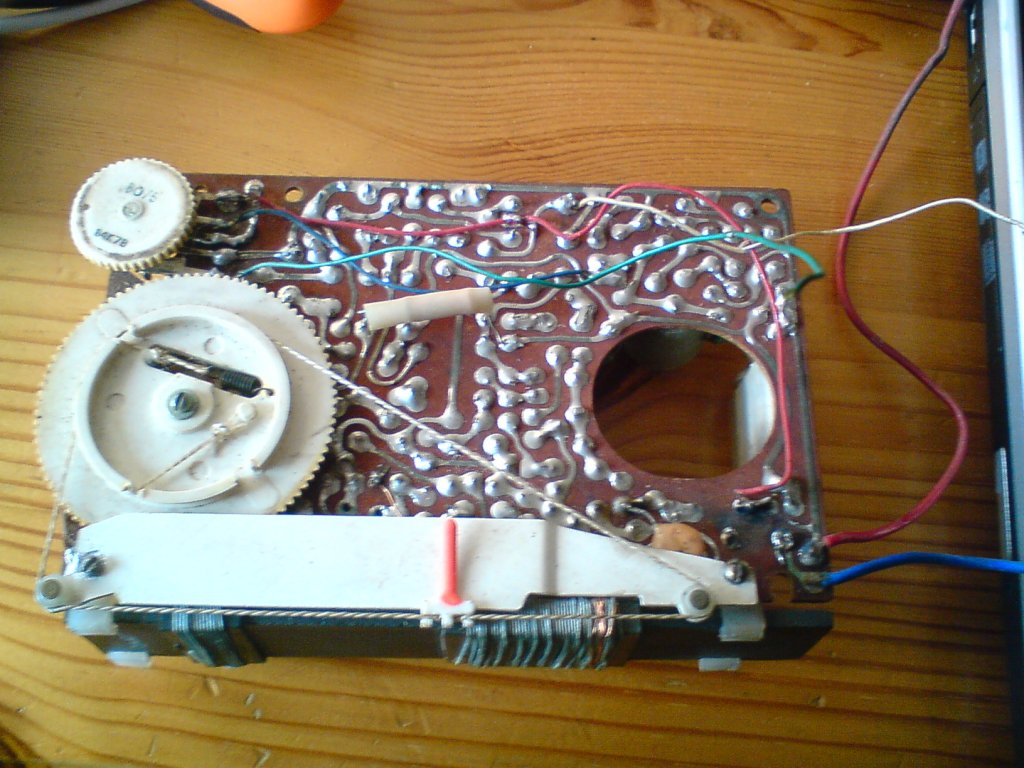 A hangszóró vezetékei (piros) először a fülhalgató csatira mennek innen két zöld vezeték megy a rádió alsó részének közepén lévő trafó (kimenő) szekunderére (jobboldali két lábára).