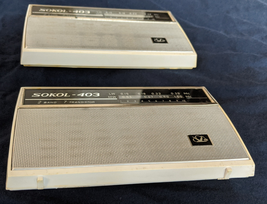 Valamikor az 1970-es évek elején a Sokol-ból Sokol-403 lett, a külső is változott. Azonban az egyformának látszó Sokol-403 rádiók sem voltak teljesen egyformák. A korai példányok vékonyabbak illetve lekerekítettebbek voltak, kerek hangszóróval voltak szerelve és az előlapjukon kis lábak voltak. A későbbi példányokba "szögletes" hangszórót szereltek, vastagabbak és szügetesebbek lettek (emiatt a bőrtok vastagsága is változott). A fekete hátlapon nincs különbség a két verzió között. Képek egy 1972-es és egy 1976-os rádióról Ugyancsak létezett egy "fordított" skálájú Sokol-403 is, feltehetően az akkor elérhető forgókondenzátorhoz kellett alkalmazkodni a skála megfordításával: https://www.radiomuseum.org/r/moscowtemp_sokol_403_2.html A hozzászólás módosítva: Jan 19, 2020