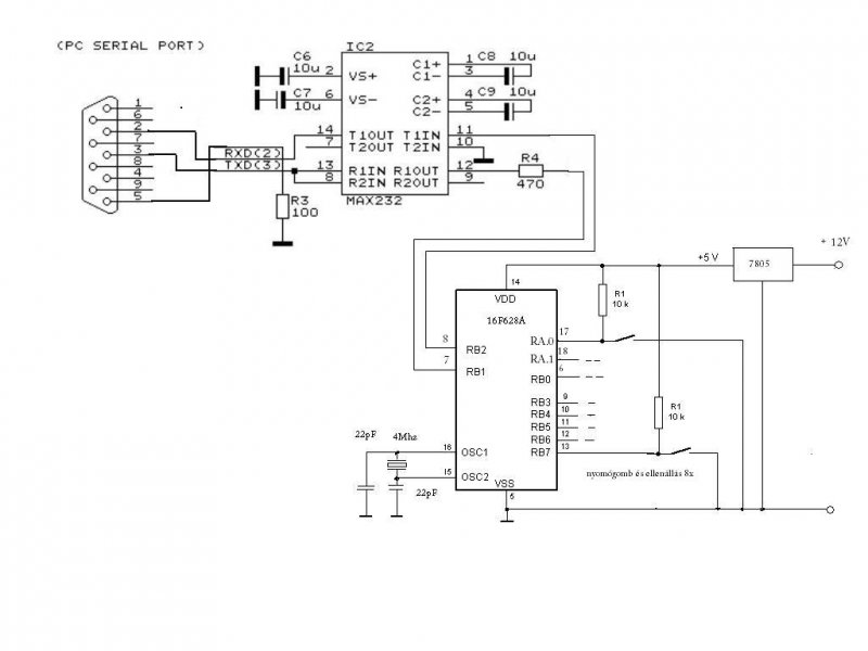 Egyelőre próbanyákon van a kapcsolás, ha jól emlékszem akkor vagy 100nF vagy 1µF van a max232 mellett a tápelőállításban. A tápfesz szintek a maxon mérve: + - 8 Volt. Kondi értékeket nem tudom, most épp nincs nálam az áramkör, szombaton tudom megnézni. Szerinted mit érdemes a max mellé pakolni? 100nf/1µF (gyári pdf-ben 1µF volt)