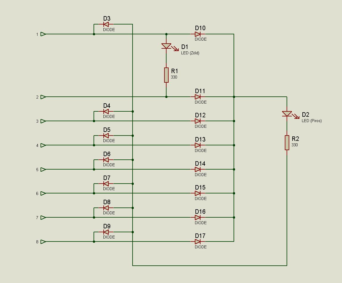 Az átláthatóság kedvéért 1+ és 2- kombináció esetén világít a zöld LED, minden más esetben a piros, de majd átvariálod maganak, ahogy szeretnéd. Első pillantásra úgy tűnhet, hogy 1+ és pl. 8- esetén is világít a zöld, de nem fog. D1 - R1 - D11 alkatrészeket söntölni fogja D10. szerk.: Kicsit elrontottam, 330 helyett 220 Ω-os ellenállások, diódáknak jó lehet pl. BAT43. A hozzászólás módosítva: Okt 4, 2024