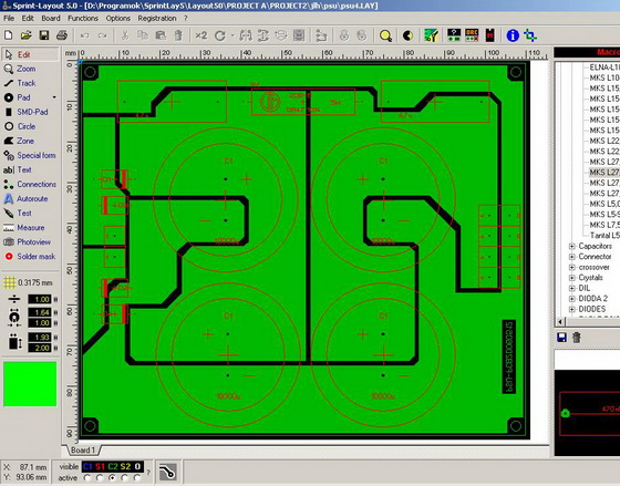 Pontosan. Alapbeállításnál a komponens felül, míg a rézfólia alul látható. De nyomtatásnál úgy is észreveszed ha valami nem stimmelne. Persz ha úgy mented el hogy fordítva(tükrözve) , akkor a következő megnyitásnál automatikusan azzal a beállításal nyitja meg az elmentett munkádat. Szóval ez az alapbeállítás ahogy a képen is látható:alkatrész felül , fólia alul. A rétegbeállításnál pedig a C2aktíválva.