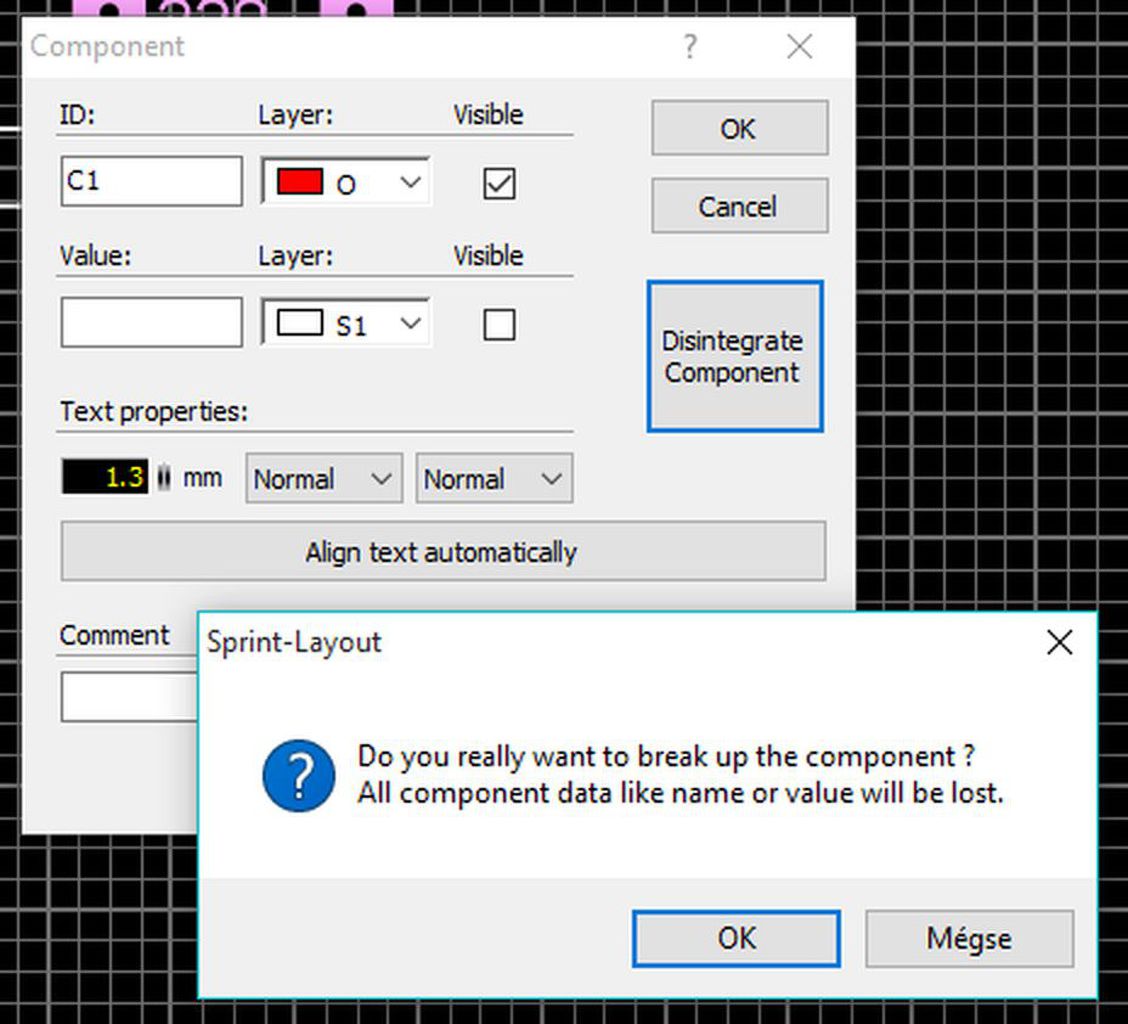 A rétegek variálása azért nem jó, mert ugyanazt a paneltervet többször is egymás mellé/alá/fölé stb. másolnám, és az egyes másolatokon más-mást kellene megjelenítenem/tükröznöm/forgatnom stb. Ezt csak úgy tudom megtenni (korlátlanul), ha a felirat már nem kapcsolódik az ő alkatrészéhez, hanem önálló szövegként létezik. Ez nem olyan részlet, amit joggal elvárhatunk egy paneltervező programtól, de nekem sokszor szükségem lenne rá. Ezért gondoltam talán másnak is, és ha ebben nem tévedek, akkor talán van egy kapcsoló vagy pipa, amit aktiválva esetleg létrejönne, hogy ha a "Disintegrate Component" parancsot kiadom, akkor megszűnne a komponens, de a szövegei nem törlődnének a rétegről.