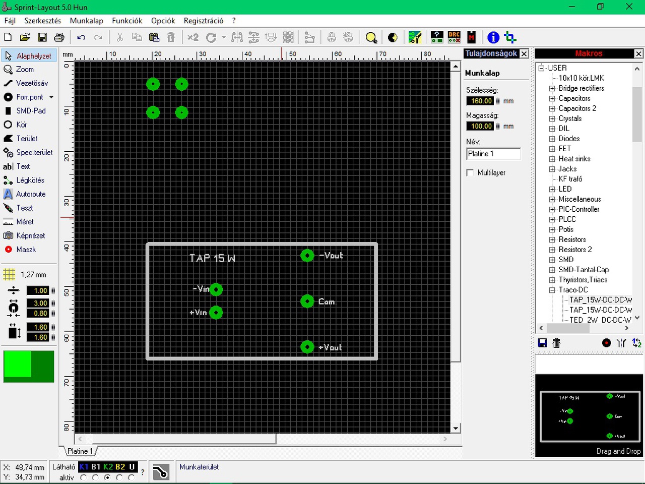 Ha jól látom 1mm-es négyzethálón dolgoztál, ami nagy gond, mert semmilyen szabványalkatrészhez nem passzol. Egy raszter 2,54mm, ezzel számoljál. Ennél egyel kisebb (fele) a 1,27mm én ezen a hálófelbontáson szokok tervezni (vagy még finomabbon ha szükséges). De ha kézzel rajzolod a panelt akkor 2,54mm alá ne menj, mert nem fogsz tudni olyan finom vonalakat rajzolni. Amíg kézzel rajzoltam addig én is 2,54mm-es hálón dolgoztam.