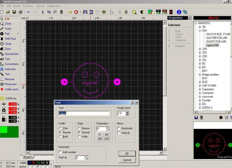 Nem kell sok makrót készíteni elég akár egy is. Csinálsz egy alkatrészt a szokásos módon példáuul egy ellenállást C2 a forrszem /S1 meg az alkatrész teste vagy kőrvonala. Majd hagyod az s1 es állásba az asztalt és behozod a textet , írj akármilyen szöveget , alkatrészértéket bármit. Vidd bele az alkatrész testébe , vagy akár mellette is hagyhatod ahogy jónak látod. Majd az egészet jelöld ki és erősítsd meg a build group opcióval. Ha ezzel végeztél akkor bármikor ha rákattintasz a text felíratra azon az alkatrészen ahol így csináltad a dolgokat az egér bal gomjával kétszer ., akkor beugrik a text menű és bármire változtathatod azt az értéket amit az alkatrészedhez készítettél. Ennyi