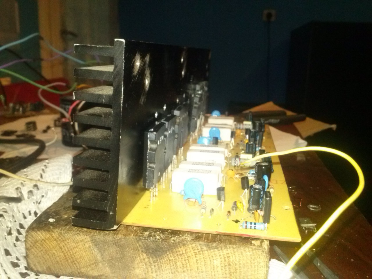 A 820 R es ellenállásra ráforrasztottam egy 750 R ellenállást így az eredő ellenállás kb 390 R lett. Sokkal jobban szól, így már nem kell a 470 pF kondenzátor értékét se megváltoztatni. Ja és tápágankénti 10000mF-os kondenzátorokat, még kísérletként megspékeltem 270000mF-al, amint a képen is látszik. Annyira jól szól így hogy megépítem a párját is. Ami a melegedést illeti, az L idomra rátettem még egy komolyabb alubordát szinte nem is melegszik. Kísérletként a 0,47 R emiter ellenálláson 10 mV –ot az 1K potival feltekertem 40 mV-ra de ugy se melegedett . Aztán visszavettem a 10 mV-ra.