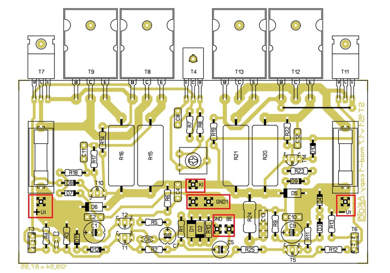 Pár helyen kevés, vagy nagyon a határon lenne a tranyó feszültségtűrése. Rajzoltam egy ajánlást. A T7, T11-re nagyon oda kell figyelj, mert a bázis-emitter helyet cserél. Huzallal kell keresztben bekötnöd.