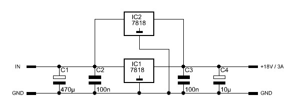 A 7818 max. 1,5A-t tud, de kettőt párhuzamosan kapcsolva kb. 3A-ig jó!