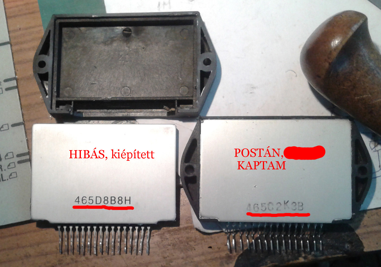 A termék a szokványos smd-power smd kombó, amelyik áramkör alig várja, hogy elharapja a hangdobozunk torkát. Nekem egy NDK kis hangdoboz mélynyomóját végezte ki, de én is ludas voltam benne. A barátomnak ajándékozott CA-120 Fisherben én cseréltem az eredeti rosszat az itthon vett leendő rosszra. Aztán a kókányolt hangdobozok és a nála levő magasabb hálózati feszültség, stb elindította villanyos cunamit. A végtranyók a majdnem teljes zárlatot, vagy pár Ohmot mutatnak. A jelölt alkatrész az utólagos jusztírozás jeleit mutatják, ezt a gyártás során kézi úton tehették bele, körülötte folyasztószer maradék látszik.