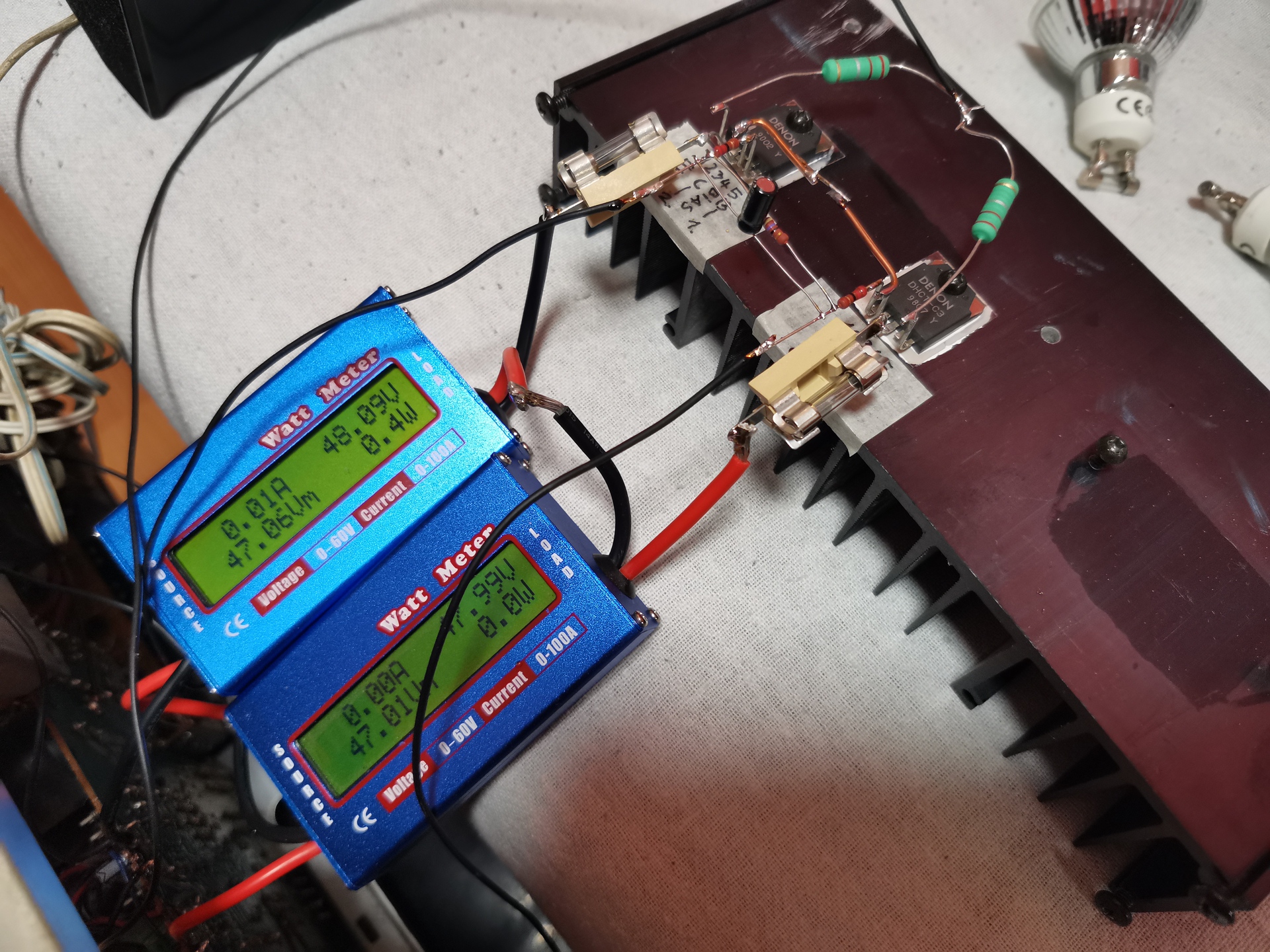 4 Ohm műterhelésen járattam őket felváltva. 100Hz en 4A kimenő árammal és 15V kimenő fesszel. A gyári borda sztereó terhelésben nem tudná lehűteni a két oldalt csak ventilátor beiktatásával. De nem is erre tervezték az erősítőt, hogy hosszú ideig ekkora terhelést kapjon.