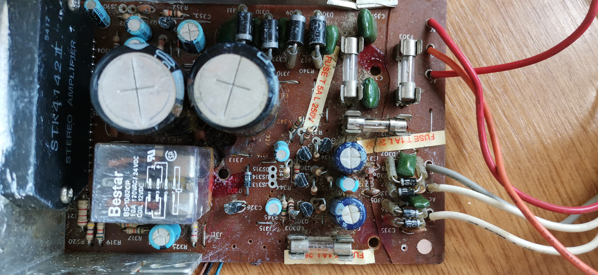 Cseréld ki a kis kerámiakondenzátorokat legalább 100V-ra, vagy méginkább 500V-os kerámia kondenzátorokra, mindegyiket, mindenféle mérés nélkül! Sokszor ezek okolhatók gerjedésért, melegedésért és megmagyarázhatatlan hibákért, tönkremenetelért. A táp hidegítő és szűrőkondenzátorokat érdemes mérni és cserélni, ha szükséges.