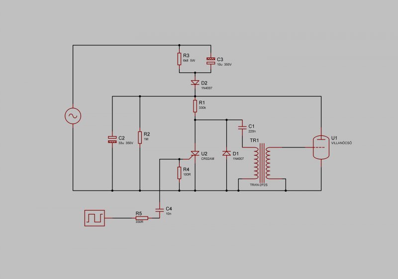 Neki kell látni módszeresen a hibakeresésnek. Hátulról visszafelé:Tehát meg kell próbálni a TIC106 gate vezérlését. Ide elég 1.5V elem sorbakötve 1k ellenállással. A gate és a test közé érintve egy pillanatra be kell, hogy kapcsoljon a tirisztor-elvillantva a csövet. Ha ez nem következik be, akkor mérni kell a tároló elkók töltési feszültségét, az alkatrészek helyes bekötését. A rajz elvileg jó. Vagy majdnem.....