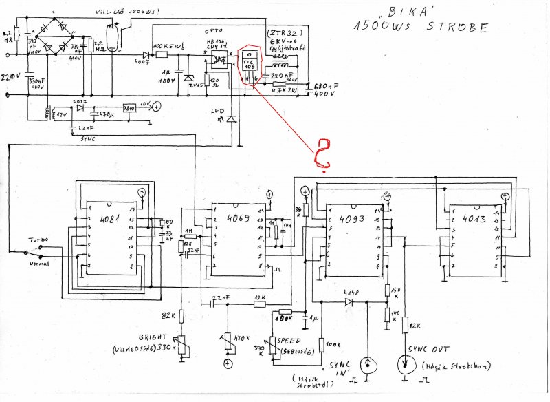 Ma gyakorlat órán megcsináltuk a stroboszkópot. Az igazság az,hogy az általam csatolt rajz egy kalap sz*r. Az ellenállások értékei iszonyatosan nagyok benne. A valódi hiba,amiért nem szuperált az a gyújtótrafó volt,valami gond volt vele. TV kimenővel próbáltuk utána,majd tekercseltünk neki egy új gyújtótrafót. Még lesz rajta változtatva,ha kész lesz a "remekmű" felteszem a módosított működőképes rajzot,ha igény van rá. Addig is a segítségért sok-sok köszönet Zatykó tanár úrnak,és neked is.