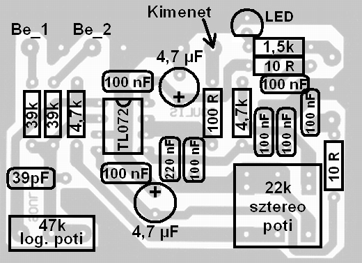 Nincs kapcsolási rajzom, itt találtam a beültetési meg a nyák rajzot a forumon, csak az tünt fel hogy a 4,7 µF-es kondenzátor pozitív lába van a gnd-re kötve.