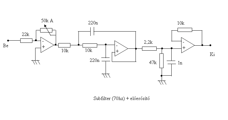 Építettem egy saját tervezésű subfiltert, előtte hangerőszabályzó (előerősítős), mögötte preamplifier. Kb 70hz-n vág, szépen szól, nem torzít. Csak az a baj vele, hogy nagyon lecsökken a jel, nagyon halk. Végfokként egy A - osztályú hiraga dolgozik (max 60 w, de nekem olyan 20-30-al szól táp miatt). A poti után, még hangos a jel, viszont a szűrés nagyon lecsökkenti. Elméletileg 27k, és 100n volt a szűrőben, de gondoltam a 10k is elég, hátha e miatt van, de nem. A rajzot csatolom. Remélem valaki tud segíteni. köszi