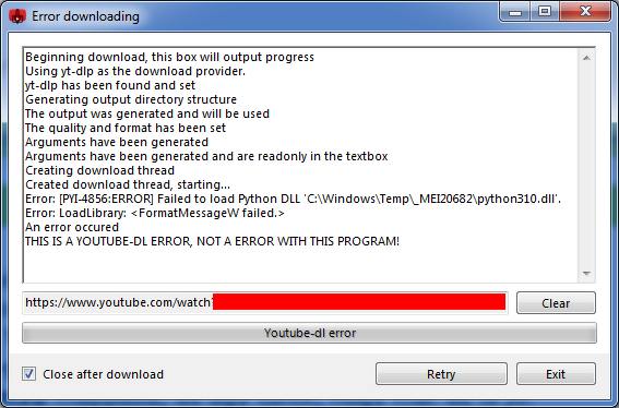 youtube-dl errorÜdv, egy kis fejtörő így estére...Találtam a youtube-dl -hez egy GUI-t és azzal próbálkozom. Az működik is, de a youtube-dl -nek valami baja van. Ott kezdődött, hogy hiányzik neki az MSCore100.dll szóval telepítettem a Visual C++ runtime -ot, ez megoldotta. Aztán hiányolta az api-ms-win-core-path-l1-1-0.dll fájlt. Letöltöttem netről, betettem a System32 mappába, és úgy tűnik, hogy már ez is jó. Viszont mikor indulna a letöltés, nem tudja betölteni a python310.dll -t úgy néz ki. Ez már kész agyrém. Most komolyan még phytont is telepíteni kell ennek a hulladéknak? Idézet: „Beginning download, this box will output progress Using yt-dlp as the download provider. yt-dlp has been found and set Generating output directory structure The output was generated and will be used The quality and format has been set Arguments have been generated Arguments have been generated and are readonly in the textbox Creating download thread Created download thread, starting... Error: [PYI-9252:ERROR] Failed to load Python DLL 'C:\Windows\Temp\_MEI87122\python310.dll'. Error: LoadLibrary: <FormatMessageW failed.> An error occured THIS IS A YOUTUBE-DL ERROR, NOT A ERROR WITH THIS PROGRAM!” Egyébként Win7 64 bit. A python310.dll fájlt is levadásztam, betettem a program mappába is, meg a System32 mappába is, de ezt már nem eszi meg, még mindig hiányolja. Mondjuk azt se értem, a Temp mappában a _MEI87122 mappát honnan veszi, mivel nincs ilyen mappa benne. A hozzászólás módosítva: Dec 26, 2024