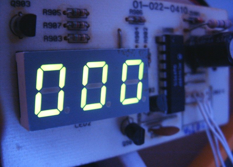 Van egy a képen látható kis kijelzőmodul. Ezt egy régi számítógépből termelték ki de nem tudom hogy milyenből, és milyen célt szolgált. Azt hiszem egy MMX -es CPU -val szerelt gépből szerelték ki, a kábel közvetlenül az alaplapra ment. Sajnos az alaplap már nincsen meg. A kijelzőt egy MC14499P típusú hétszegmenses kijelző dekóder/meghajtó ic vezérli és szemmel láthatóan működik. Gondolom csak pontos időzítéssel tudom meghajtani. Esetleg nincsen valami program amivel RS232 -es portról megtudnám hajtani? Kábelezés azért van beforrasztva, mert próbáltam kézzel meghajtani. Úgy hittem hogyha a CLK lábat földre húzom akkor kerül leolvasásra a DATA vonal, ezt így eljátszom még 19 -szer és kiírattam egy háromjegyű számot a kijelzőre, de nem történt semmi. Amikor a CLK nincsen földre húzva, akkor lassan frissíti a kijelzőt, csak 888 -at ír ki, ha földre húzom a CLK -t akkor 000 -át ír ki.