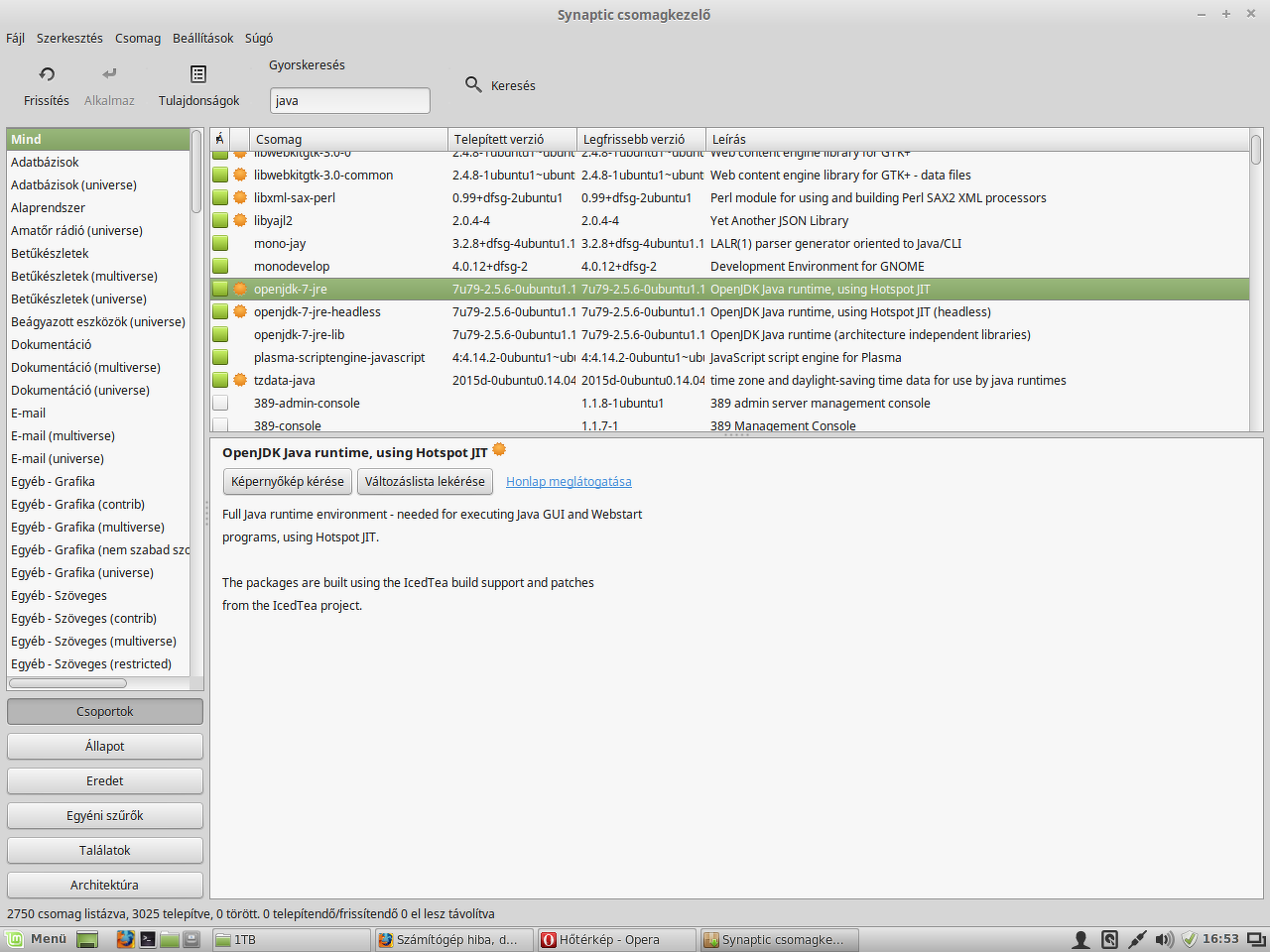 Itt a további lehetőségeknél kiválaszthatod a jar-os telepítőt. A terminált nem kell ilyen esetben futtatni. A Java-t pedig a Synaptic csomagkezelőből telepítsd. A Java-runtime-ra két katt, bezöldül, majd alkalmaz.
