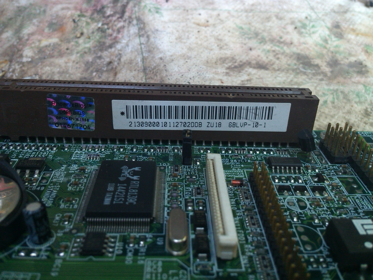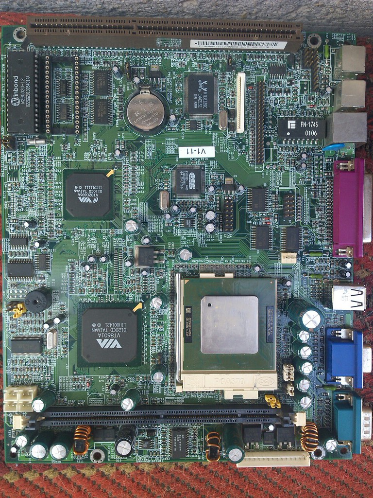 Ez egy Via PLE133 chipsetes (VT8601B északi híd, VT82C686B déli híd) Pentium 3 alaplap. Jelenleg egy Intel Celeron proci lapul benne. PC100 ill. PC133 SDRAM-ot kezel (max. 1GB), és Riser csatlakozón keresztül lehet hozzá bővítőkártyákat használni. Valószínűleg valami kis irodai számítógépben lehetett. A gyártó jelzését nem látom sehol, de a típusa: 6BLVP.