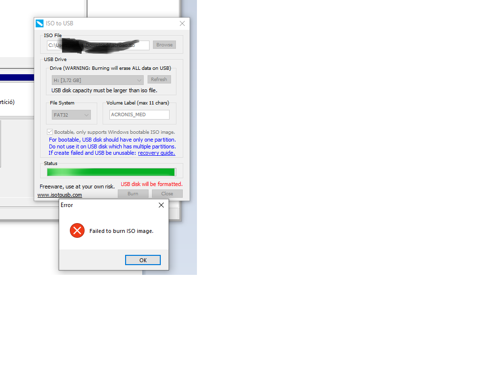 Én pont két napja csináltam acronis "lemezt". Nem szórakoztam ISO-val, az acronis programja elkészíti. Sajnos az ISO2USB szeret néha kiakadni, vannak olyan ISO fájlok, amiket nem eszik meg és változatos készültségi foknál adja a hibaüzenetet.