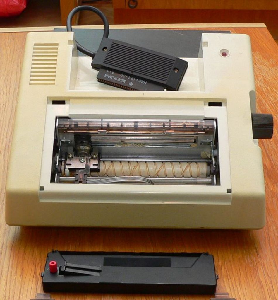 Seikosha, "egytűs mátrix". ![]() Egy vékony függőleges kis kalapács rohangált benne, ami a megfelelő pillanatban rácsapott a papír mögött forgó bordástengelyre. Igen, az a menetes orsó mozgatta a fejet. A bele való papírtekercs szélessége kb. mint a WC papír. A nyomtató előtt a festékszalagja látható. A hangja egy ISZONYAT volt, nem lehetett megmaradni mellette. A sebessége sem volt nyolc lap/perc, de grafikusan is nyomtatott!