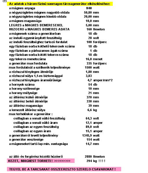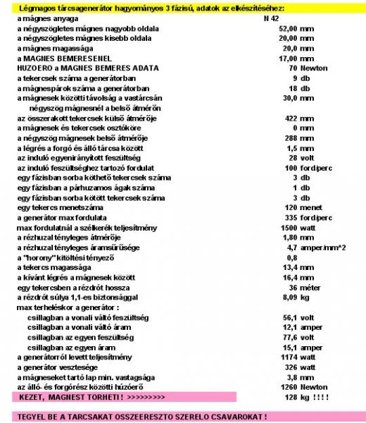 Ha Te vagy más csak kíváncsi egy tárcsagenerátor adataira, vagy kisérletezni akar, én vagy Erbe szívesen kiszámoljuk a méreteket (tíz perc). Azzal nem lesz gond.