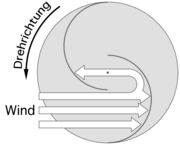Így néz ki a klasszikus Savonius működési elve. Eszerint szokták elrendezni a félhordókat. A szél rángatásának csökkentése érdekében legalább kettőt szoktak egymás alá tenni, 90 fokban eltolva.