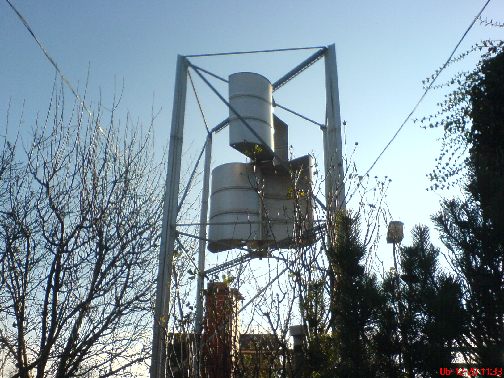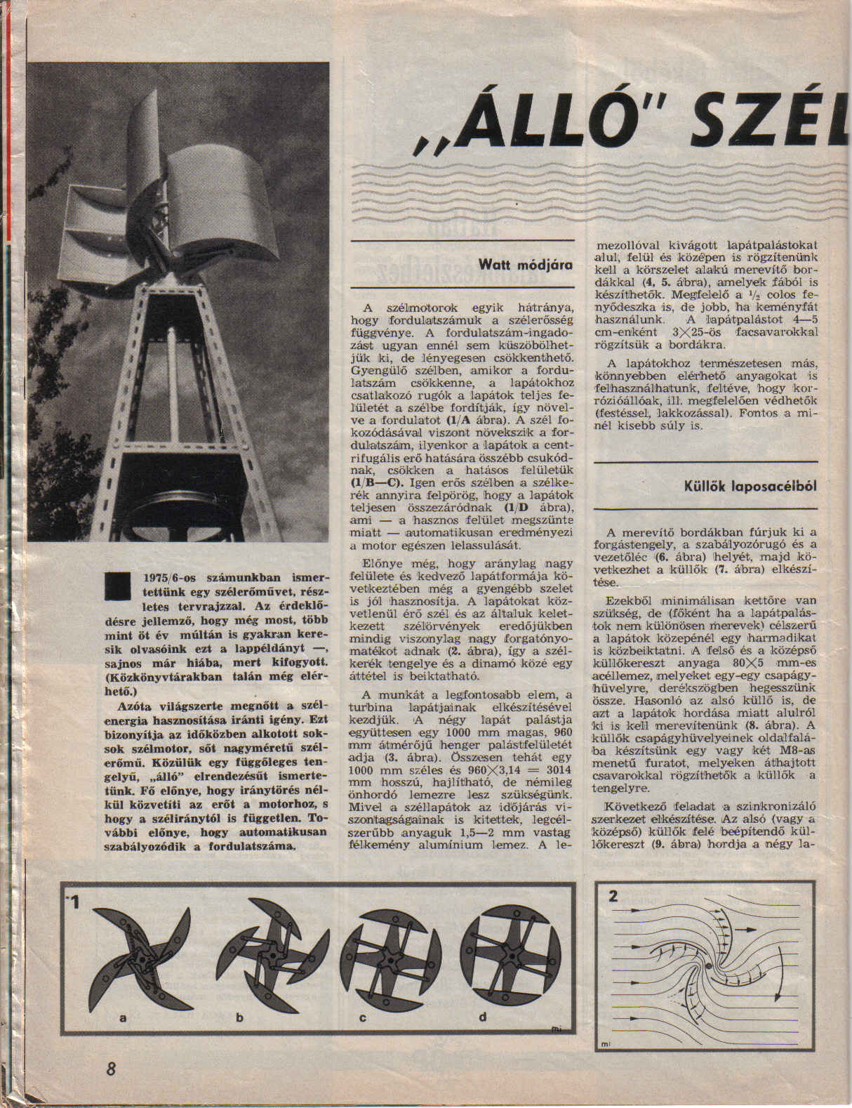 Rátérnék az én problémámra: Felmerült nálunk is az igyény 1 szérlkerékre vízszivattyúrás céljából. Azt már eldöntöttem, hogy nem hagyományos(vízszintes tengelyű) szélkereket építek. Ugyanis megfogott a Savonius-Darrieus tipusú szélkerek érdekes alakja, egyreszűbb tartószerkezete és mechanikája, és nagy nyomatéka, egyetlen érv ami ellene szól az a alapcsonyabb hatáfok(lsb képek). Az alapelv azóta elég sok "variánst" hozott: giromill, turby, stb. A pontos kinézet az VAWT1 képen látható, de gondolkodom, hogy inkább VAWT2 elvét használnám... A problémám csupán az hogy nem tudom kitalálni a túlpörgés elleni védelmet, valahogy meg kellene "szüntetni" vagy legalábbis erősen csökkenteni a lapátok felületét. mert 1 sima fék úgyse fogná meg...