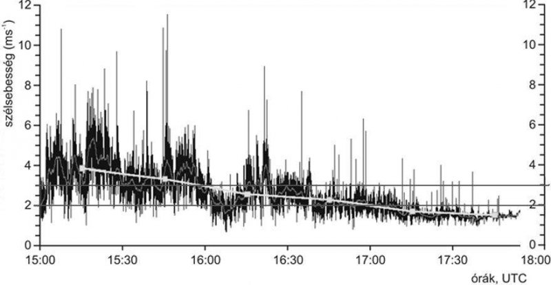 Keresek olyan mért adatot a szélsebességről, ami átlag 2-3 m/sec szélsebességnél mondjuk egy órán belül (vagy 10 perc) megmutatja 20-50 mérés pillanatnyi szélsebesség értékeit.