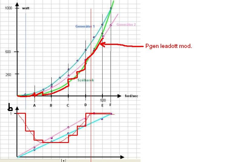 Ha ez meg lenne építve, akkor az első munkatartományon (gen és rotor metszésponttól balra) a renszermunkapont a monitor mögött (kevesebbet termel mint amennyit tudna, a szélrotor miatt), metszésponton pontosan a monitoron (pont annyit terlem mint amennyit tud), 2es munkatartományon (g,r metszésponttól jobbra) meg a monitor elött (megint kevesebbet termel mint amit tudna, de itt már a generátor és a terhelés miatt) alakulna ki az állandósult állapot (renszermunkapont). Ezért a vízszintes tengelyre leginkább a V szélsebesség vihető fel, mert a rotor fordulatszámesése az ami önszabályozza ezt a rendszert (terhleve esik a fordulat, ennek négyzetével esik a generátor teljesítmény, mivel Ugen~RPM)