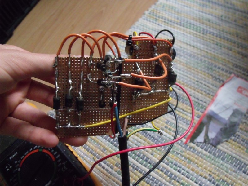autó generátor diódáim vannak csak, ill voltak mert mikor furógéppel meg akartam forgatni jobban, valami elszállt a diódákban..Ami tuti hogy egy 12v 21wattos izzó világít vele fényesen mikor kézzel tekerve 1 perc alatt 60at forgatok a tengelyen,van egy akkus csavarozóból kiszedett 18v os villanymotorom ezt is rákötöttem, ha egy perc alatt kb 80at forgatok a tengelyen akkor úgy fütyül a kis motor majdszét esik. Diódák nélkül próbálva ha 2 kivezetés között mérek váltófeszt akkor 600as fordulaton 265v ot ír.Ha 800al pörgetem akkor 430v.(A 3. vezetéket nemtudom hova kössem mérésnél), de szerintem így a 3. fázis nemis vesz részt a mérésben.
