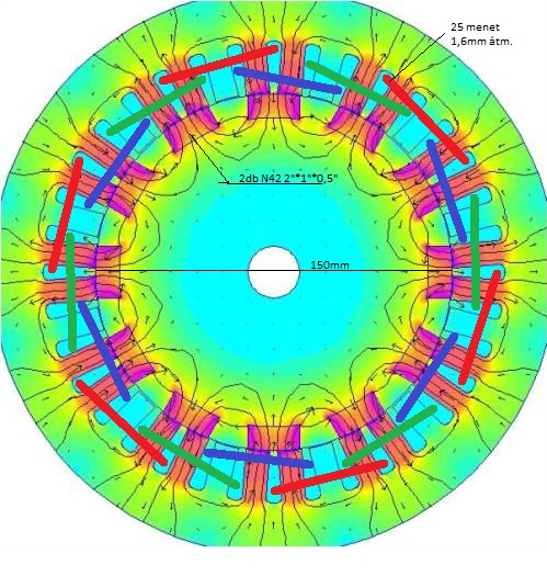 Én is a fejembe vettem egy régi mágneses generátorom átalakítását, ami most éppen témába vág. Az eredeti generátor 4 pólusú volt, két fázisra tekerve 0,75-ös huzallal. Eredetileg 800W körüli teljesítményre volt képes. Ezt szeretném átalakítani kicsit a meglévő neomágnesekkel, és huzallal, amit még tárcsagenerátor építéshez szereztem be anno. Van 24 db N42-es mágnesem, és elég sok 1,6 mm-es huzalom a tekercseléshez. A cél 2-3 kW kinyerése lenne 3- 400 közötti fordulaton, és 200 V egyen feszültség minél alacsonyabb fordulaton ( hálózatra szeretném visszatáplálni majd egyszer. A mostani agyammal a csatolt képen látható verziót képzeltem el, de ha lenne ennél jobb ötletetek, azt szívesen meghallgatnám.