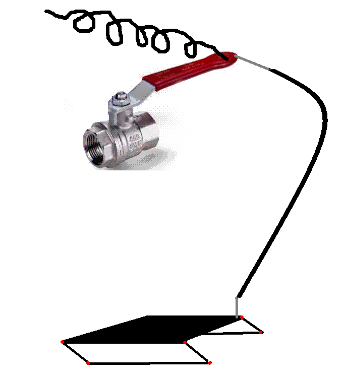 Egy rugó a csap karját zárt állapotban tartja, a kutya pedig ha inni akar, úgyis közel meg a csaphoz. Rááll egy lapra, ami megnyitja a csapot. Egy dobermann bármilyen rugó ellenében hatásos lesz... Próbáltam lerajzolni, mire gondolok. (bowden húzza a csapot, így akárhová lehet rakni a ráállós részt -piros pöttyök a forgáspontok) Nem túl elektromos megoldás, de szerintem jobban ellenáll a szakadó esőnek és a vicces kedvű kutyának (ha fémből készül)