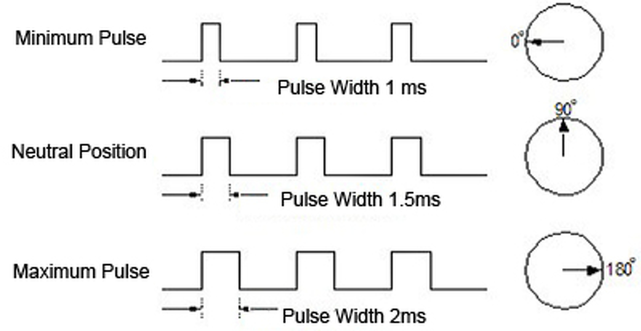Hogy az elején kezdjem: a szervókhoz kell egy vezérlő áramkör, a harmadik vezetéken (ami fehér, vagy sárga) kapja a vezérlést. Maga a vezérlés nem túl bonyolult, a vezérlő impulzus szélességével (1-2 ms) pozicionálják a szervót. Az 1,5 ms a középállás, az 1 ms az egyik véghelyzet, a 2 ms a másik.