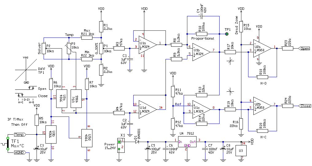 Akkor egy kis löket a témához. TCA965 Ablakkomparátorral egyszerűbb lenne az élet, ha kapható lenne még. - A termosztát a hőfok elérésekor nyit. Biztonsági okokból készítettem így, mert szakadás esetén is leszabályoz. - Ha a termosztát működik akkor a trimmerrel tudod beállítani, hova álljon a szervo. - A beállító potikkal soros 1kohm ellenállás azért van, mert a szervóban lévő állásjelző poti, nem mehet mechanikusan a végállásig. Ennek tényleges értékét a beállítás alapján lehet meghatározni. (Nyitva-zárva, hol áll az állásjelző poti.) - Persze ahhoz, hogy ez "valami legyen", ki kell dolgozni a teljes áramkört. De ha egyfázisú kondis szervomotorod van, akkor esetleg két antiparalell kötött SSR relé a kimenetek közé, és már ketyeghet is a dolog. üdv! proli007